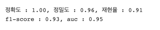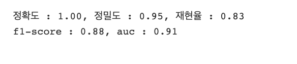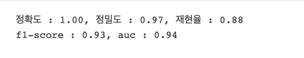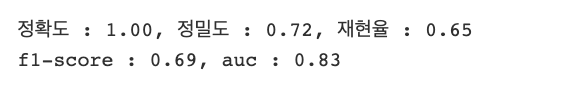 print('정확도 : {0:.2f}, 정밀도 : {1:.2f}, 재현율 : {2:.2f}'.format(accuracy,precision,recall))