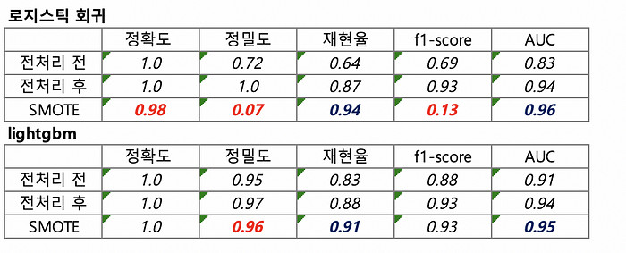 물론 lightgbm 같은 경우는 “scale_pos_weight” 과 “is_unbalance” 의 파라미터 튜닝을 통해 어느 정도 성능을 높일 수 있으나 해당 데이터 셋으로 테스트 해본 결과 SMOTE를 통해 오버 샘플링한 모델성능이 가장 좋은 것을 확인할 수 있다.